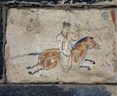 它的“不一般”,首先在于其“极简却传神”的艺术风格。该砖的画面以赭石色为底,墨线寥寥,却生动勾勒出一位策马疾驰的驿使:头戴魏晋帻帽,身着右衽短衫,左手控缰,右手举着文书。而骏马则四蹄腾空,动态感十足,一种风驰电掣的紧迫感似从画中扑面而来。更耐人寻味的是,画师刻意省略了驿使的嘴巴:这一“残缺”设计,并非疏忽,而是古人智慧的体现,象征着邮驿制度中“守口如瓶”的保密原则,使其成为中国古代信息保密文化的生动见证。